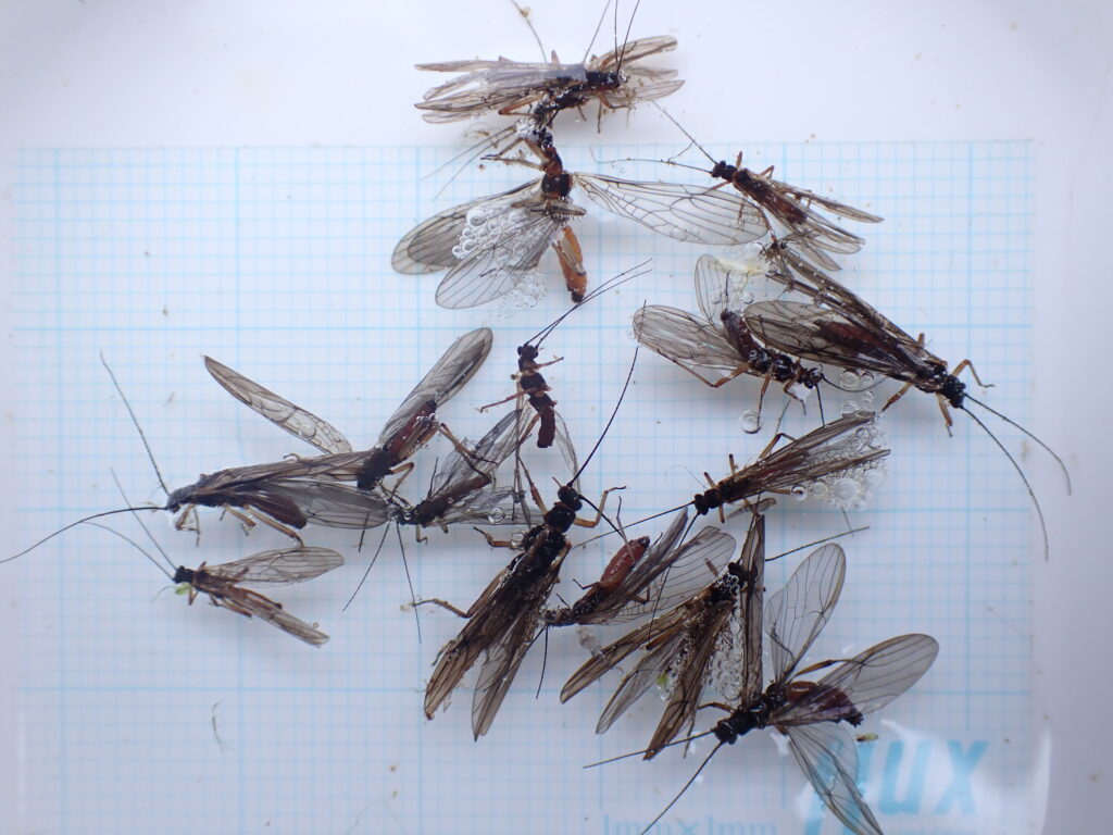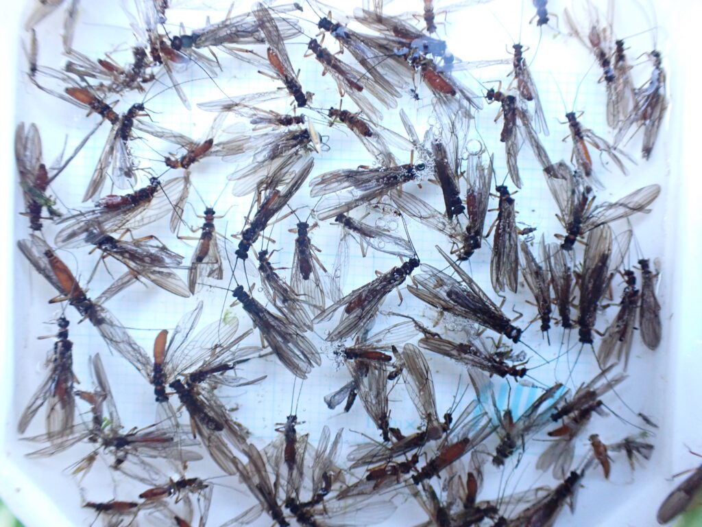 近年、ここまで多くのオナシカワゲラの流下は見たことがありません。昨年から増加が確認されている水草の影響かもしれません。因果関係を調査する方法がわかりません。できることは観察の継続です。
